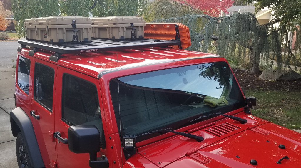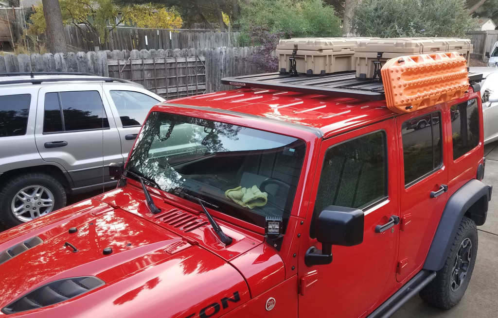 Those of you who have read through all of this little saga will remember that I had a pre-existing Rhino Rack Backbone mounting system on this Wrangler, described here. It basically provides three pairs of hard points on the roof of the vehicle to mount rack crossbars to. My Backbone kit came with heavy duty crossbars with heavy duty locking legs. If you had the same kit installed on your JK, you do not need to order the locking leg kit in the parts list above. You will already have the legs you need on the crossbars you have on your Jeep.
