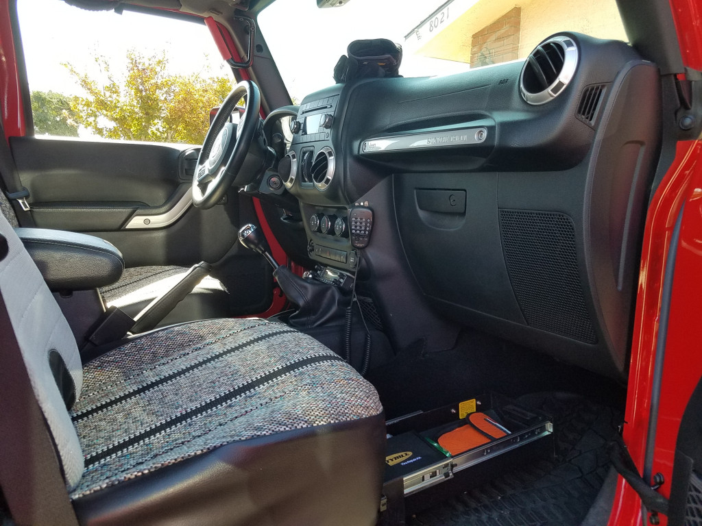 Also visible is the Tuffy Security Products 293 JK Conceal Passenger Side Security Drawer. It was a gift from Vicky the Christmas I took delivery of the LRB. I have alternate CCW methods, so I use this to carry tools related to tire maintenance and repair in it, along with some hardware for the Hi-Lift jack mount. Visible is the Smittybilt 2733 Tire Repair Kit and the ARB505 E-Z Deflator Kit (Brass). I got mine from 4 Wheel Parts in Santa Ana.