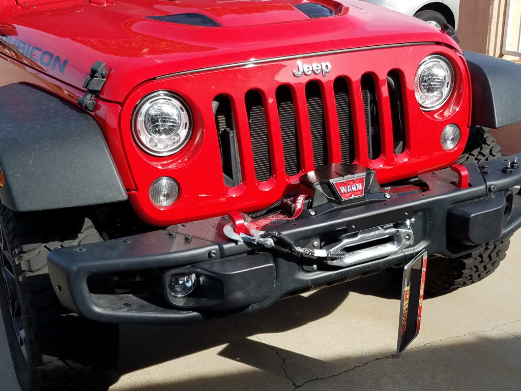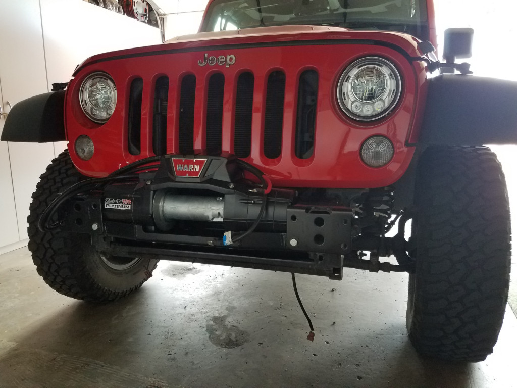 I wheel solo a lot, so I try to be ready for anything. To that end, I figured a good winch would be great insurance against long walks in the dark. Above we see me about halfway though the task of mounting a Warn Zeon 10S winch. I quickly figured out that the winch plate 4-Wheel Parts recommended wouldn't work for me, I instead chose a Maximus-3 HR1009WZ centering plate. The Maximus-3 product is specifically designed to center-mount this winch on the Rubicon Hard Rock bumper. It all fit like a glove. Once I got over that minor hurdle the rest was fairly easy, although it took me a little over a day to get the job completely finished, which included the installation of a Rock Hard 4X4 RH-4004 License Plate Mount. See the finished result below.