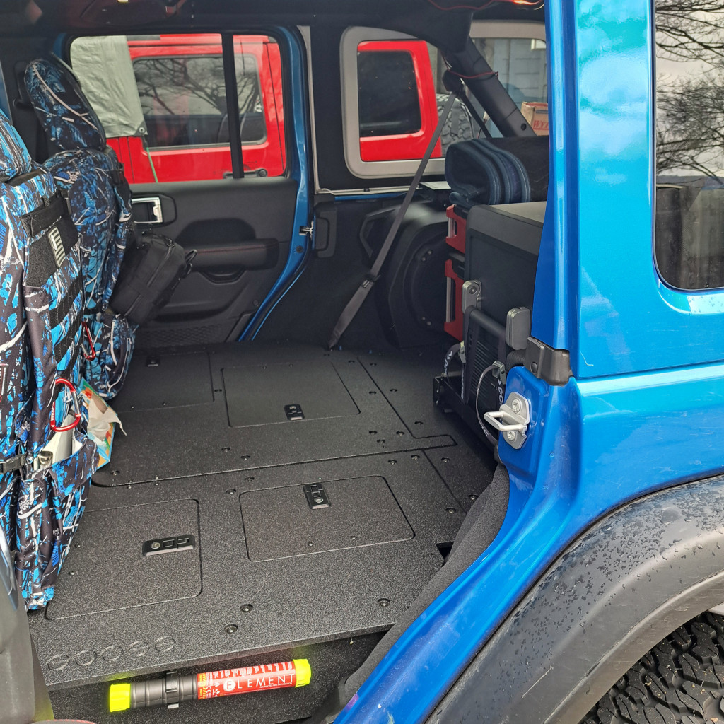 Above we see the completed V1.0 installation of the Goose Gear decking in La Conejita's Jeep Wrangler JL. I say version 1.0 because neither of is is sure the portion of the back seat that is still installed will remain there. More on that in a moment. This is the Stealth Sleep Package that Goose Gear makes for her model of vehicle. I have a very similar system in my 2017 Jeep JKUR, for which I removed the entire back seat. These decks provide a lot of under-surface storage, and also a base platform on which you can mount various camp kitchen and / or storage systems that Goose Gear makes, or upon which you can build your own systems. They are quite strong. (Info about what's in the 2017 JKUR can be found here.)