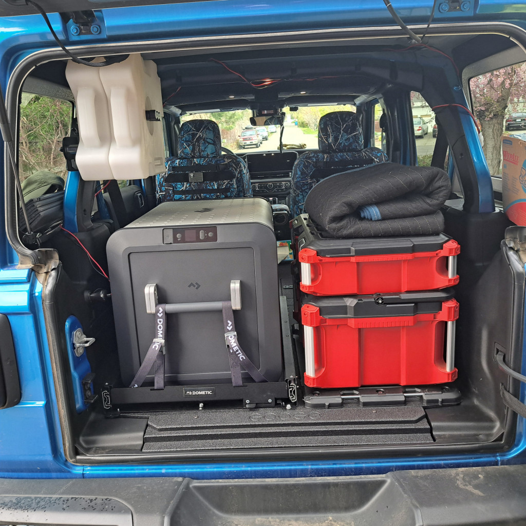 Like I said, it was a game of inches. La Conejita and I spent some time struggling with left-to-right positioning of the Dometic slide-out tray versus the Milwaukee PackOut mounting plate. Eventually we made it all work, but it took a while. The cool thing is, there is another under-deck storage hatch beneath all of this stuff (see the post dated 27 March, below), and we can still use it. It is perfectly positioned to be accessible when the refrigerator is fully extended out of the tailgate area on it's slide tray. I think that was a lucky break on our part, it certainly wasn't planned, but if any of you are reading this and thinking about your own JL, remember what you saw and read here.